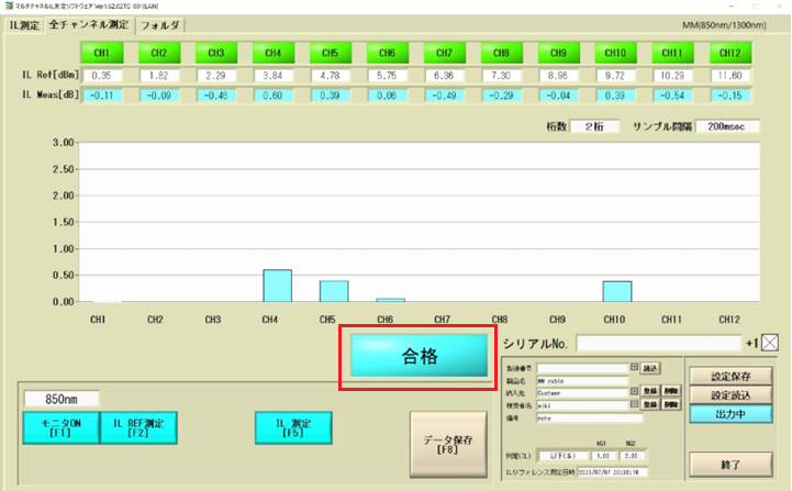 本ソフトウェアでは、全チャンネルのリアルタイムの損失値が瞬時にバーグラフで表示され、作業者が適切なタイミングを見て測定値の決定ボタンを押せます。そして測定ごとにあらかじめ設定した判定値に基づき、合否判定を行います。